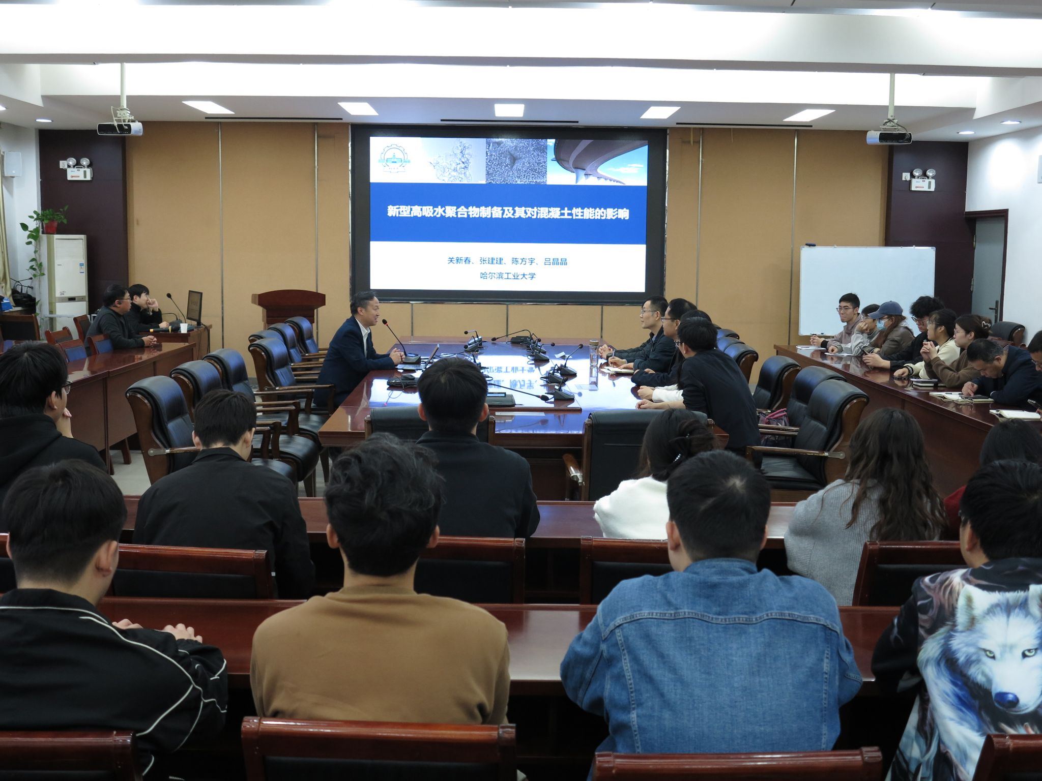 为落实土木工程学院(建筑学院)“学术创新年”工作规划,促进高性能土木工程材料领域的学术交流,分享前沿科研成果,2025年10月17日下午,应土木工程学院(建筑学院)的邀请,哈尔滨工业大学教授、教育部新世纪优秀人才关新春在32208报告厅作了题为“新型高吸水聚合物制备及其对混凝土性能的影响”的学术报告。报告会由学院副院长静行主持,学院师生100余人参加。