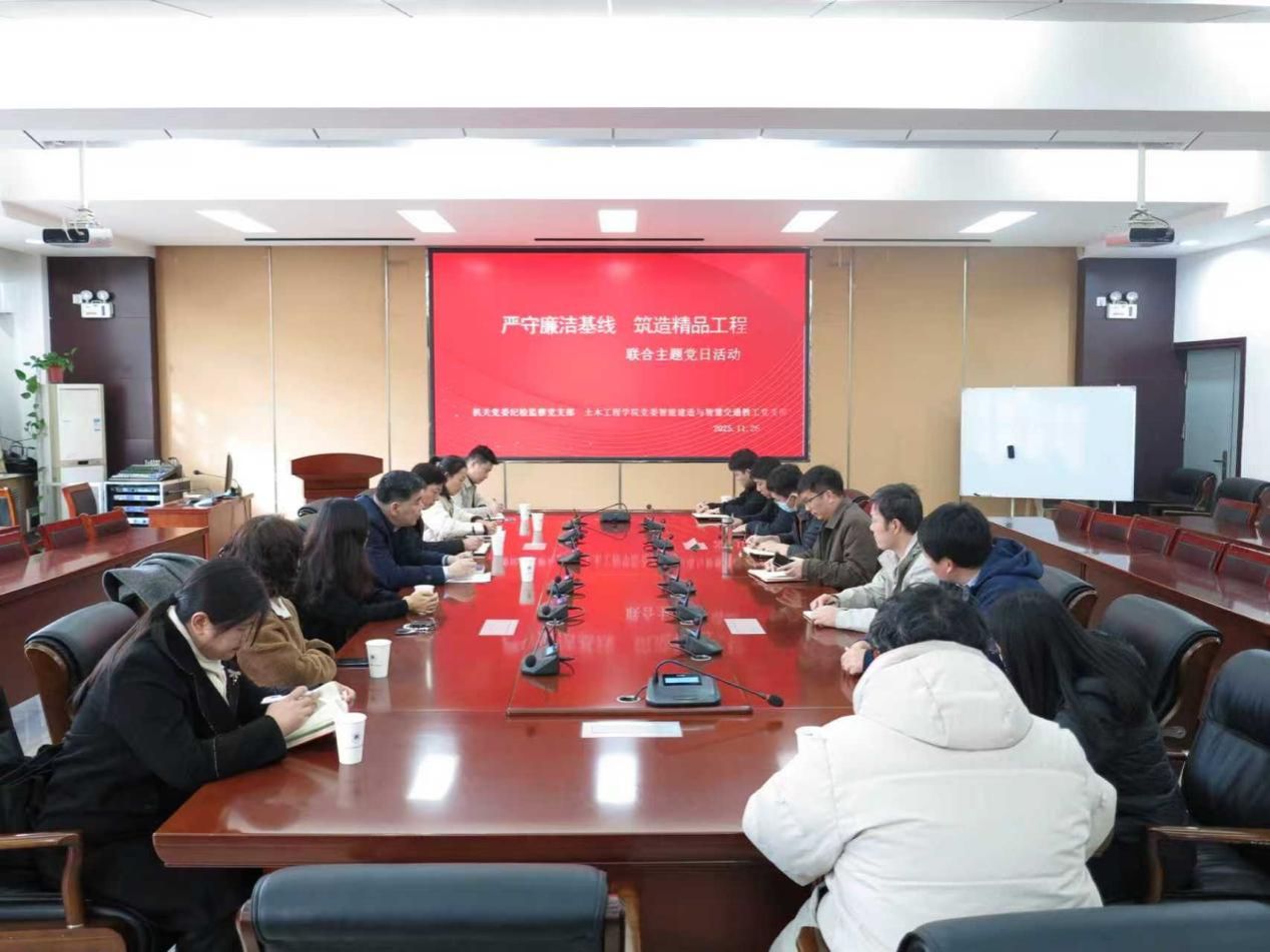 为认真贯彻落实校党委《关于开展“双融双促”机关党支部与学院党支部结对共建行动的通知》要求,11月26日下午,机关党委纪检监察党支部与土木工程学院(建筑学院)党委智能建造与智慧交通党支部在32208会议室联合开展“严守廉洁基线 筑造精品工程”主题党日活动。活动由纪检监察党支部书记王洪江主持。